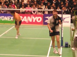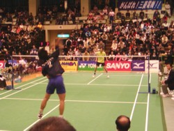 | 2002年12月22日(日)に大阪・守口市民体育館で、日本リーグ最終節が開催されました。 4面のコートを使用して、男女各4試合ずつの計8試合(1試合はダブルス・シングルス・ダブルスの3マッチ)が次々と行われましたが、1時間以上に及ぶ接戦が多く、どのコートからも目が離せない状態が続きました。 男子はトナミ運輸(前日まで6戦全勝)がNTT東日本(同5勝1敗)を2-1で下して優勝、女子は三洋電機がヨネックスとの全勝対決を3-0で制して1マッチも落とさない完全優勝を成し遂げました。 |